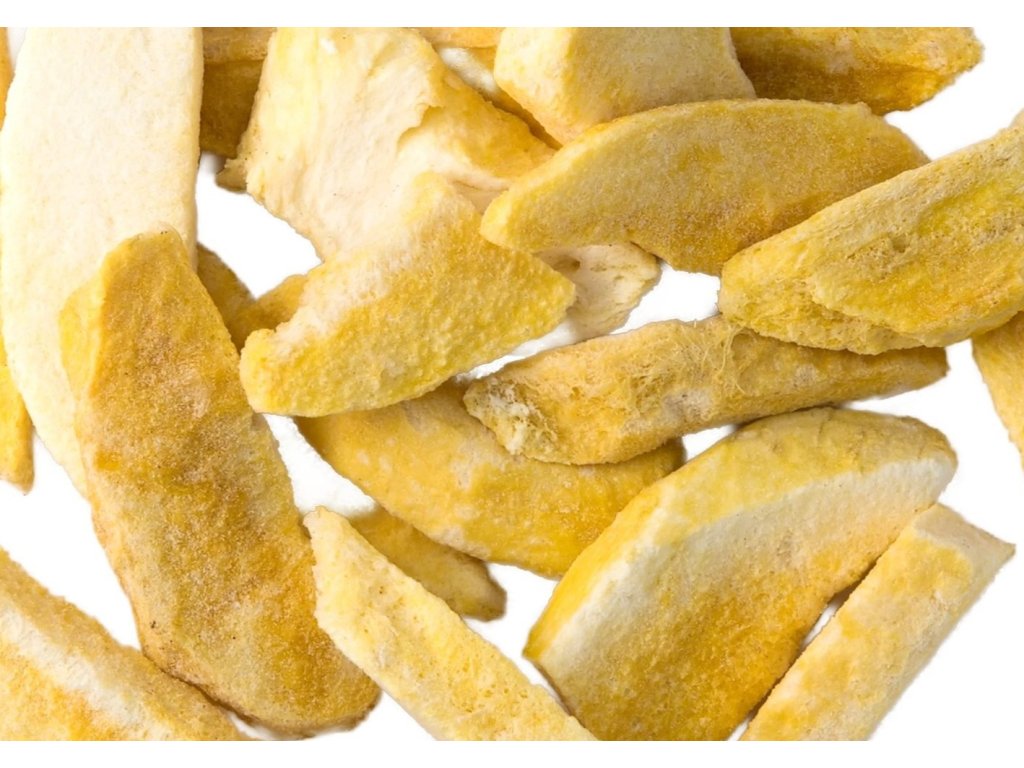 Lyofilizace je proces sušení hlubokým mrazem za velmi nízké teploty a tlaku. Tak dochází k sublimaci – voda přechází z pevného přímo do plynného skupenství. Lyofilizace z ovoce odstraňuje až 90%- 95% své původní hmotnosti. Díky tomu je ovoce tak lehké, trvanlivé a křupavé. Oproti sušení teplem je proces lyofilizace šetrný na vitamíny a minerály a díky tomu je v ovoci zachová. Ovoce je tedy téměř k nerozeznání od čerstvého ovoce.